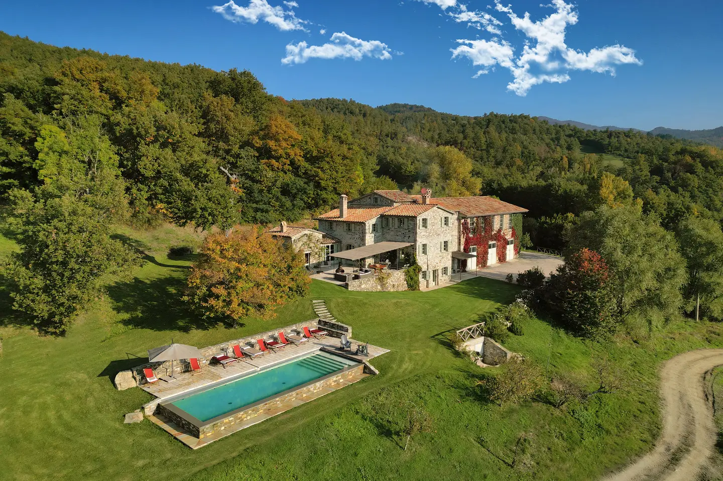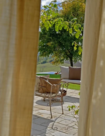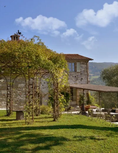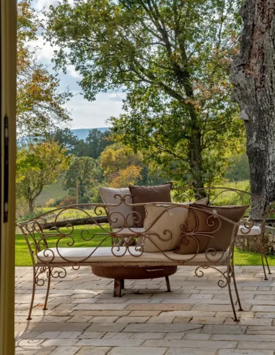 La Palazza nel Cielo domina l’ampia tenuta privata nella quale sorge tra boschi, prati e viste aperte sulla valle del Tevere. Il casale, disposto su più livelli, si sviluppa attorno a una corte esterna pavimentata in pietra chiara, vero cuore della casa nella stagione più calda, ma anche nei giorni di sole durante il periodo invernale.