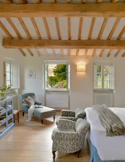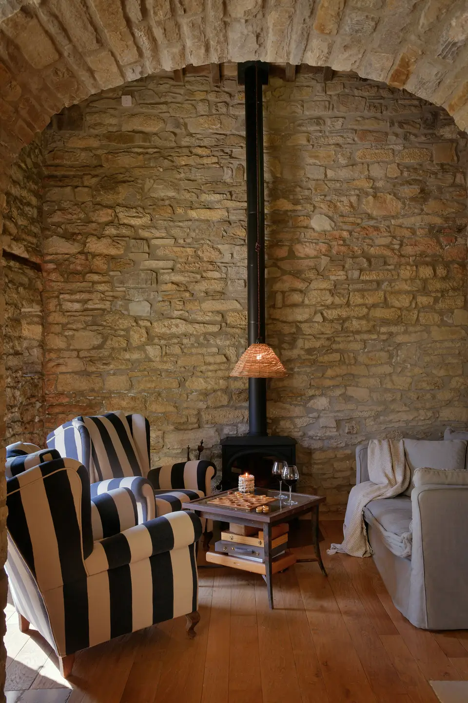 Gli interni, caratterizzati da travi in legno e pavimenti in tavole di quercia italiana, combinano design contemporaneo e materiali naturali di pregio tipici del territorio.